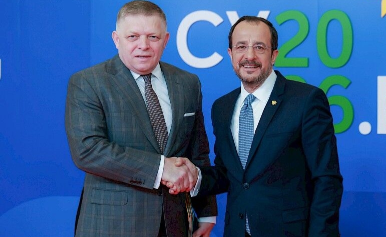 キプロスで開催された非公式EUサミットに参加したフィツォ首相(左)、2026年4月24日、スロバキア首相府公式サイトから、右はキプロスのフリストドゥリディス大統領
