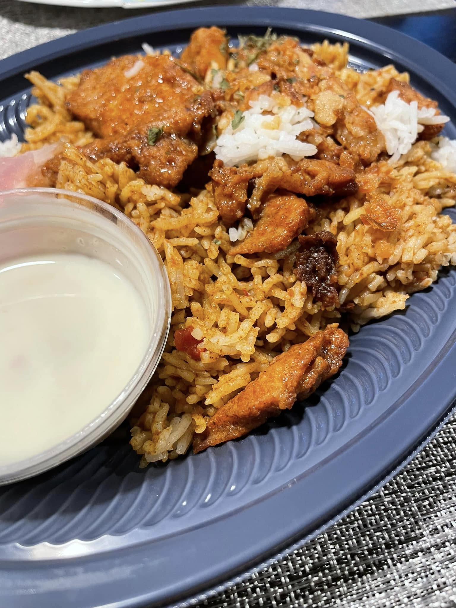 ビリヤニとはインド、バングラデシュ、パキスタンといった南アジアで食べられるスパイスが入ってチキンやマトンなどのお肉と一緒に調理された炊き込みご飯です。カレー好きの私がもしかしたらカレーよりも好きな食べものかもしれません。