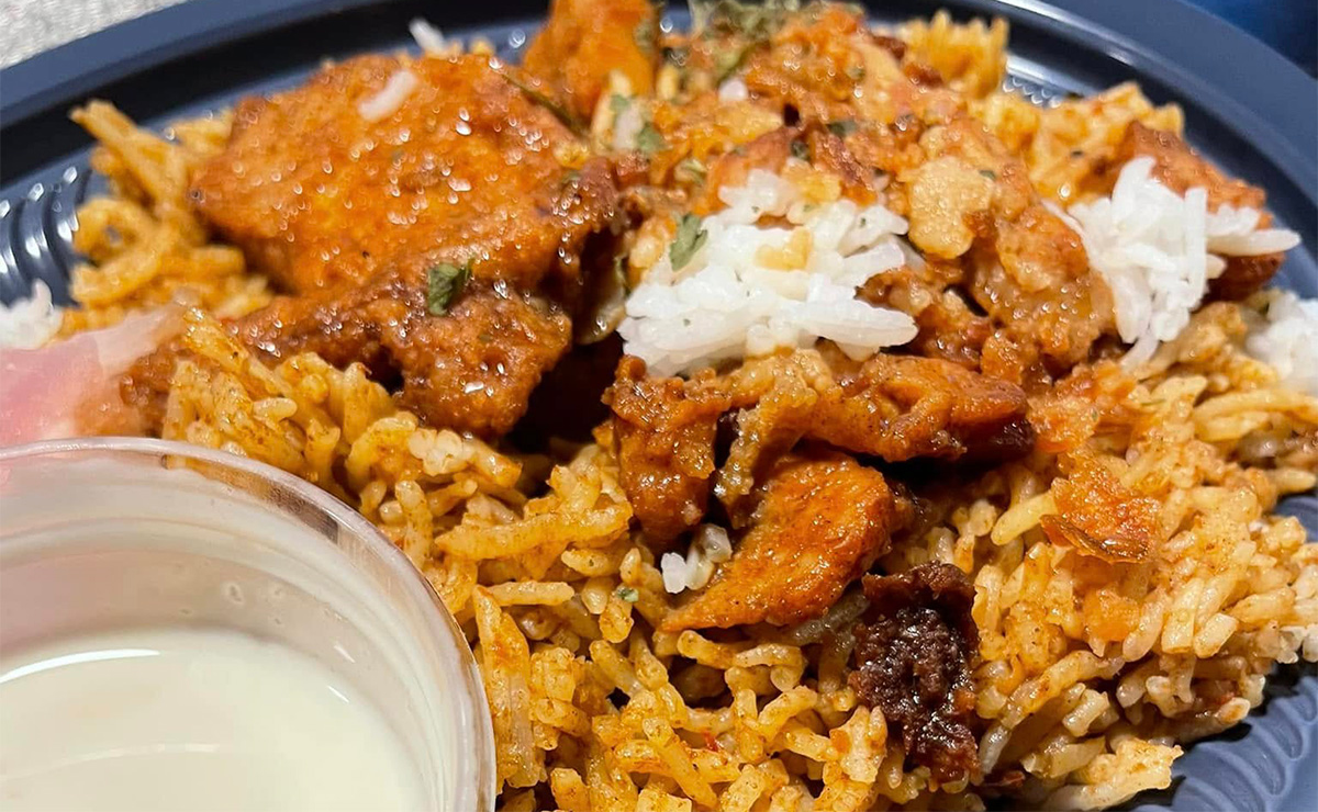 お米は本格的なバスマティ米で、しっかりチキンがトッピングされており、玉ねぎのアチャールも添えられていました。