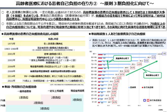 医療費の窓口負担を(年齢を問わず)原則3割負担化すべきだという財務省の資料が話題を呼んでいます。3割負担という言葉が出てきたのは初めてではないが、その「実現に向けた具体的な道筋を明確に示すべき」と提言したのは、役所としては踏み込んだ表現です。
