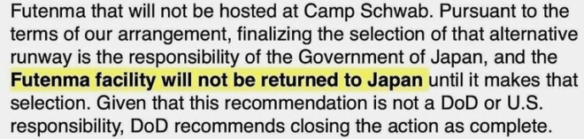 GAOが「普天間基地の滑走路は2700mあるが、辺野古は1800mしかないので固定翼機が発着できない」と指摘したのに対して、国防総省はその事実を認め、辺野古移設が完了しても、長い滑走路が使えるまで普天間基地は返還されないと明記した。