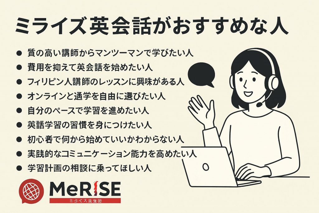 ミライズ英会話は、質の高い講師からマンツーマンで学びたい、でも費用は抑えたい、そんな方にぴったりの英会話スクールです。特に、フィリピン人講師の明るく丁寧な指導を受けたい方や、オンラインと通学を柔軟に使い分けたい方には、大きなメリットを感じられるでしょう。