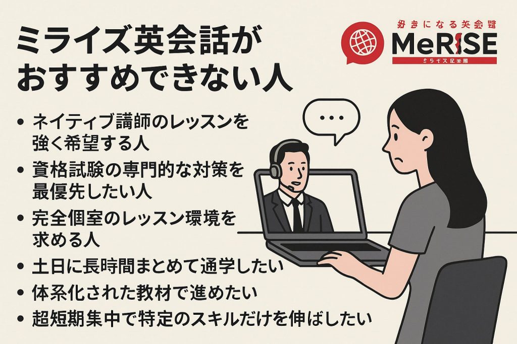 一方で、ミライズ英会話の特性が合わない方もいらっしゃいます。例えば、ネイティブ講師に強いこだわりがある方や、TOEICなどの資格試験対策に特化した指導を求めている方には、他の選択肢の方が適しているかもしれません。