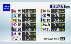 自民党の支持率が持ち直す:立民・国民が後退し参政党が支持伸ばす混とん